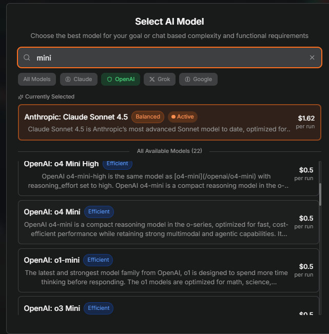 These prices directly translate to Cod3x’s credits with a markup which can be seen when choosing the model you chat with. The model we will be optimizing for in this case is for Claude Sonnet 4.5 given it has the best use of Cod3x’s tooling without error, and the best financial analysis when compared to similar models.